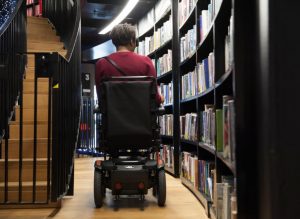 Pippa sat at a table in her wheelchair, open laptop and diary in front of her. She has a pen in one hand and is looking up and slightly off into the distance, laughing at something. She's wearing a black top and jeans with a light pink cardigan, short brown hair down.